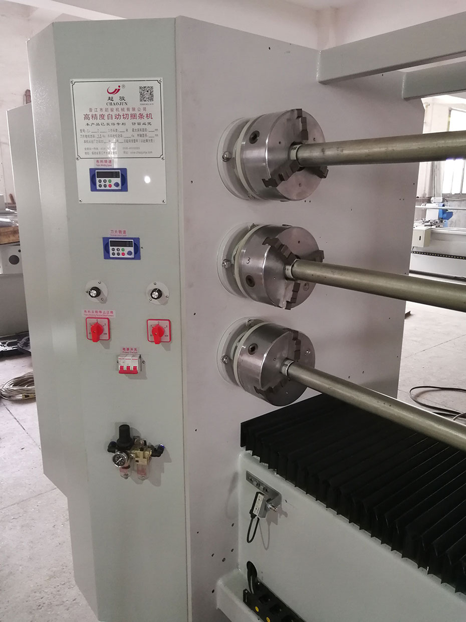 4、台板左右移位和进退刀均采用进口高精密步进系统及进口PLC控制切割宽度及进退刀切割和磨刀系统,配合进口精密滚珠丝杆及滑轨移位,高寿命,不易磨损,使切割宽度的精度达到0.1mm,最窄切割宽度为2mm,三个刀片同时进刀切割时平行快速推进,速度采用无极调速,可分段控制,纸管容易切断,达到高精度快速切出高品质的产品。